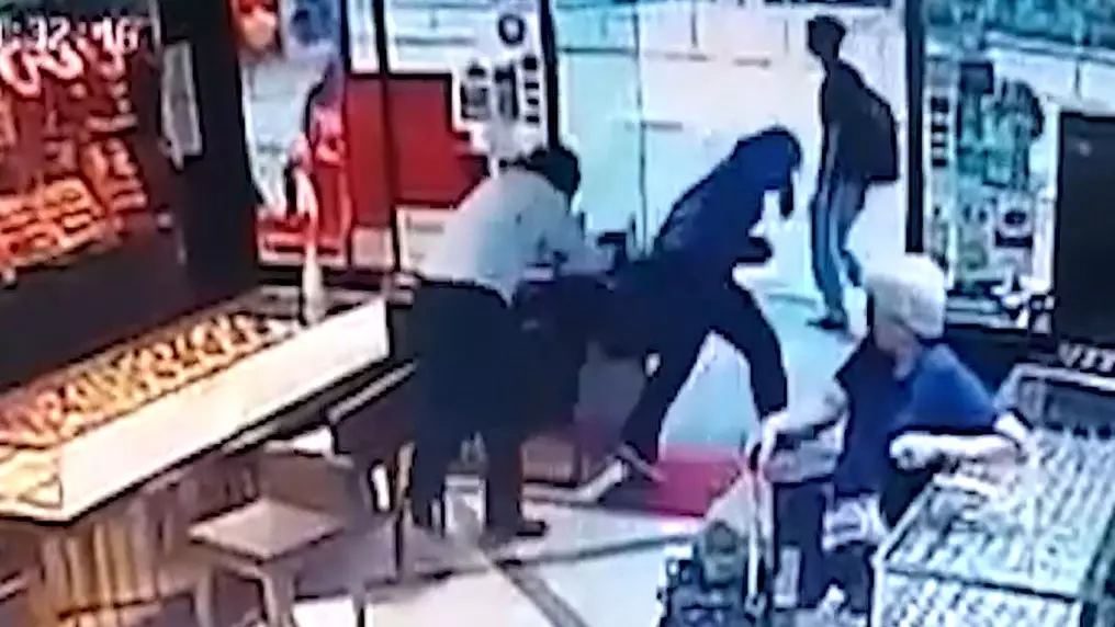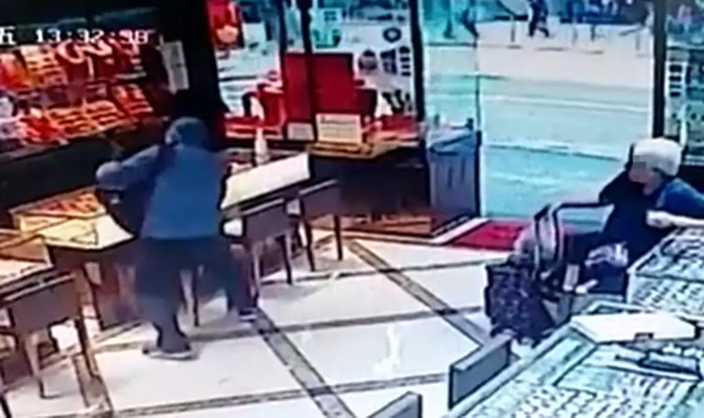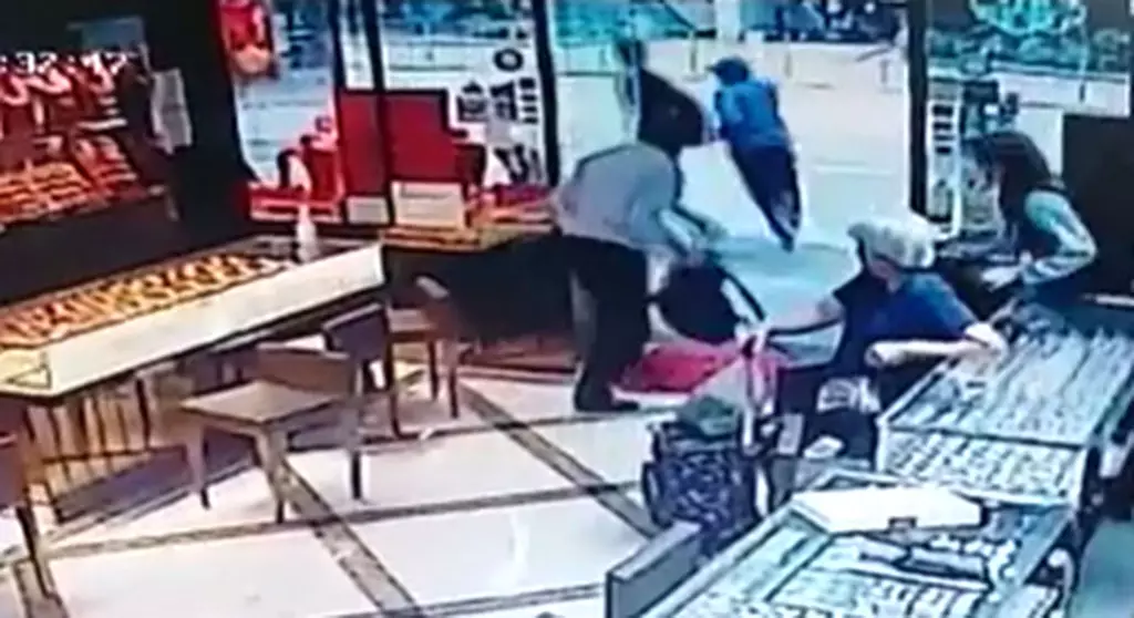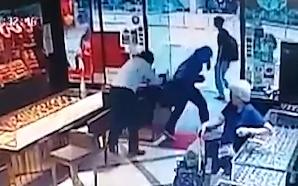 獨行賊(左)闖入金鋪打劫,並用鎚仔狂扑左邊飾櫃。