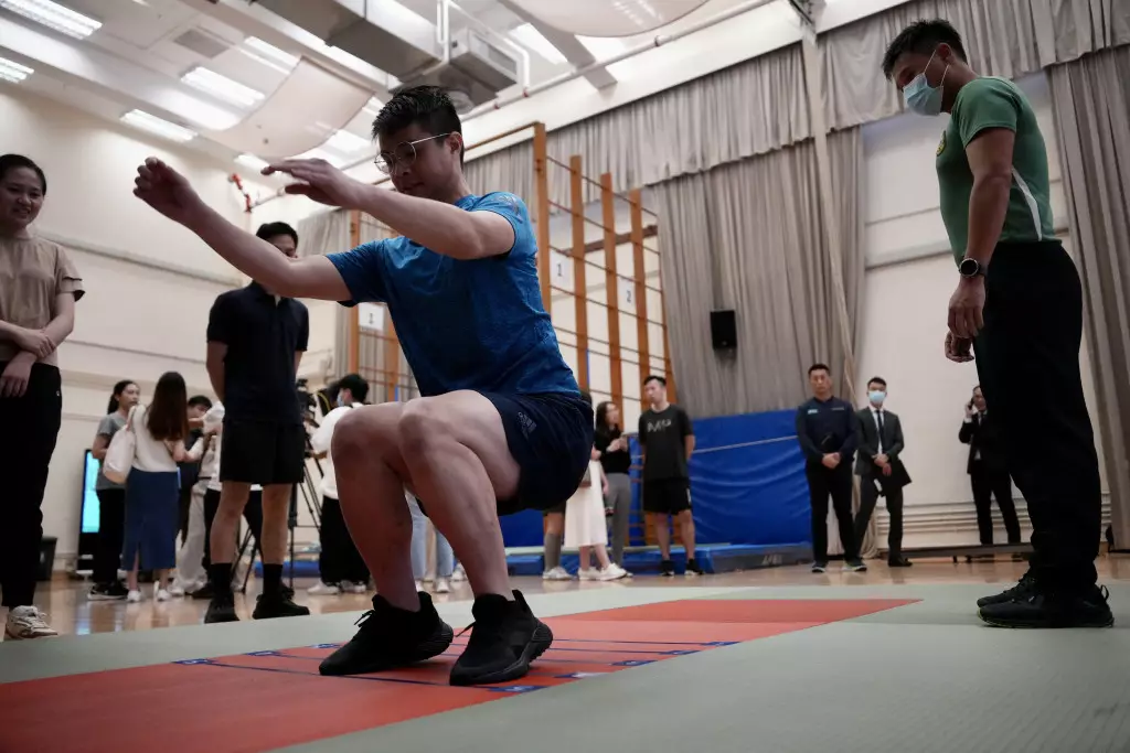 有志投考的青年體驗體能測試中「立定跳遠」項目。