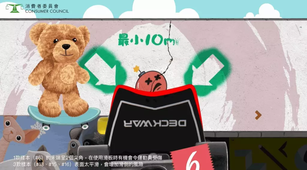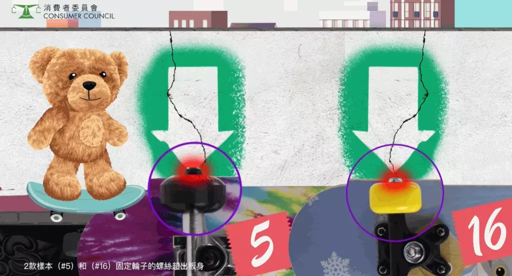 測試結果發現2款樣本「SK8ARMY」(#5)和「恆福玩具」(#16)輪子的螺絲超出板身,凸出的螺絲會增加在使用滑板時受傷的風險,未能符合標準要求。消委會提供