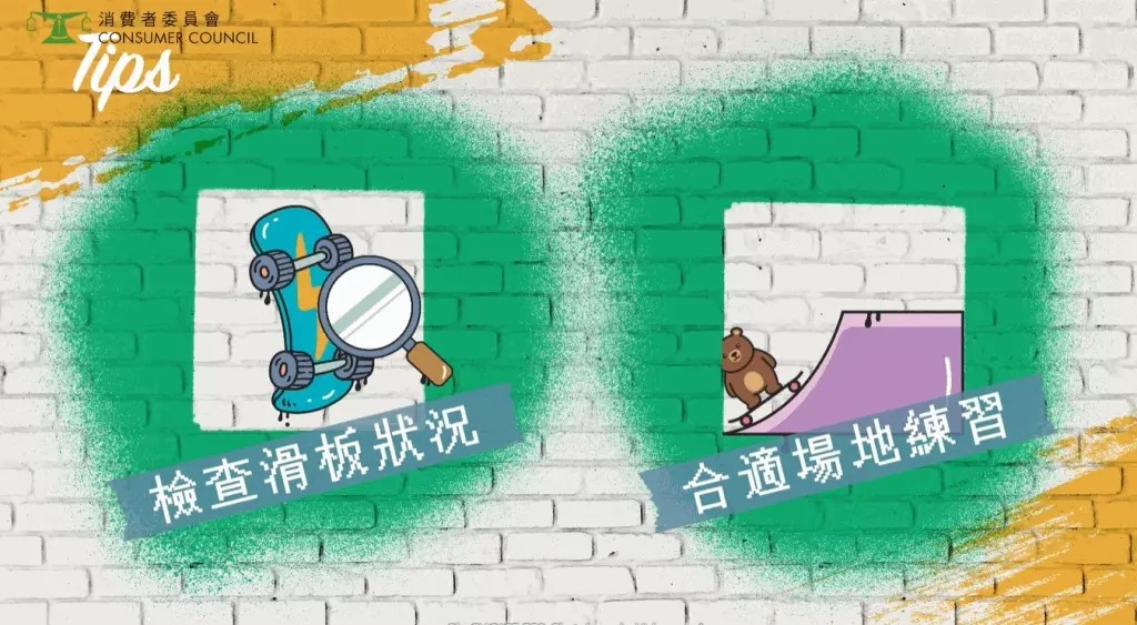 消委會建議市民,在進行這項刺激又有趣的運動前,宜先了解自己或兒童的能力,初學者最好先參加基本的滑板課程,學習基本知識才到公共滑板場進行運動。消委會提供