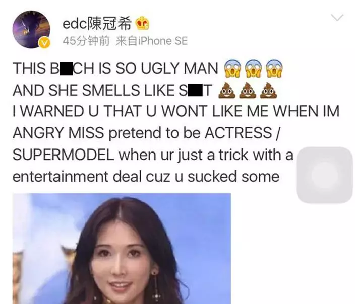 陳冠希晚上在微博上載志玲姐姐的照片,用大楷英文破口大罵:「這個X婆醜陋到極,聞起來就像屎。偽演員/超模小姐,我警告過你當我生氣時你不會喜歡我,你只是娛樂圈交易中玩把戲的人,因為你舔了X。」