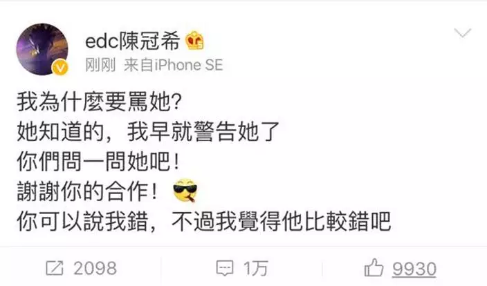 網民感到莫名奇妙,有人留言說「有好戲看」;亦有人認為Edison粗言辱罵女性要不得。半小時後Edison再以中文發微博:「我為什麼要罵她?她知道的,我早就警告她了。你們問一問她吧!謝謝你的合作!你可以說我錯,不過我覺得他比較錯吧。」