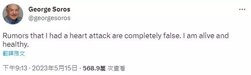 對此,索羅斯本人終於忍不住,在超過12小時後於Twitter闢謠,「謠言說我心臟病發作離世,完全是錯的。我還活著,而且很健康。」索羅斯的發言人也於15日告訴外媒,索羅斯本人沒事,社交平台上的只是謠言。