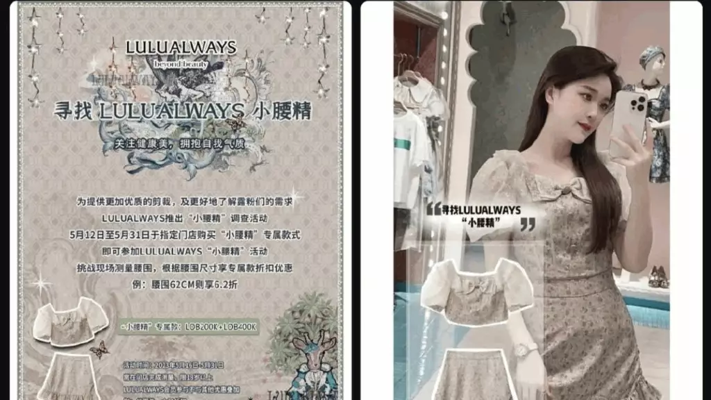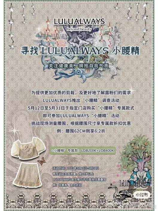 根據活動海報,活動名稱為「尋找LULUALWAYS小腰精」,聲稱「關注健康美,擁抱自我氣質」。5月16日至31日到指定門店購買「小腰精專屬款式」,可挑戰當場測量腰圍給折扣,例如腰圍62厘米則享6.2折,限18歲以上參加。62厘米即約24.5吋。網民質疑這項活動鼓勵身材焦慮。