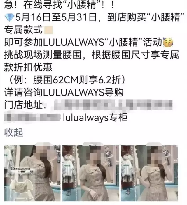 近日,內地女裝品牌LuLualways(我愛露露)推出促銷活動,稱購買指定款式,現場測量腰圍可根據腰圍尺寸享折扣優惠,例如腰圍62厘米則享6.2折。網民轟活動鼓勵身材焦慮,有店舖工作人員表示活動只為清庫存。