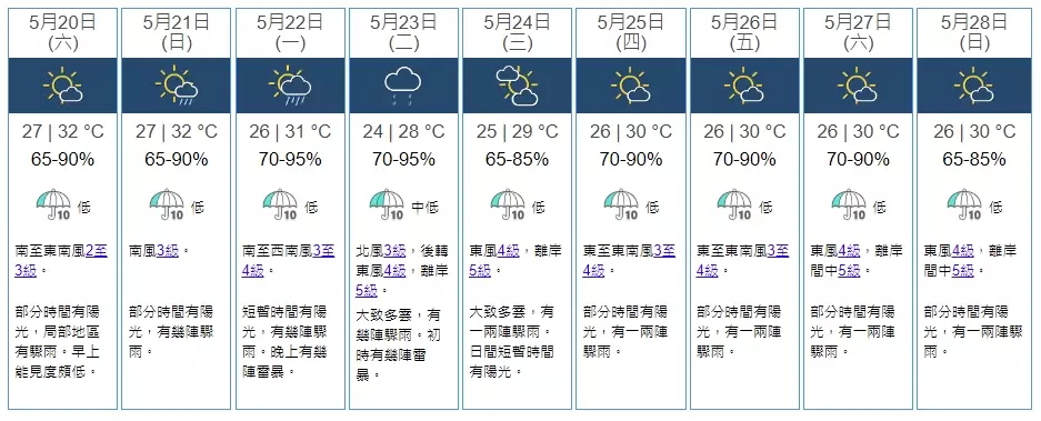 另外,天文台預料受一股偏南氣流影響,未來一兩日廣東沿岸天氣炎熱及有驟雨。又預料一道低壓槽會在下周初橫過華南沿岸,周一(22日)晚上及周二(23日)驟雨逐漸增多及有幾陣雷暴。隨後的偏東氣流會在下周中至後期影響廣東沿岸,同時一道廣闊低壓槽會為南海中部帶來不穩定天氣。