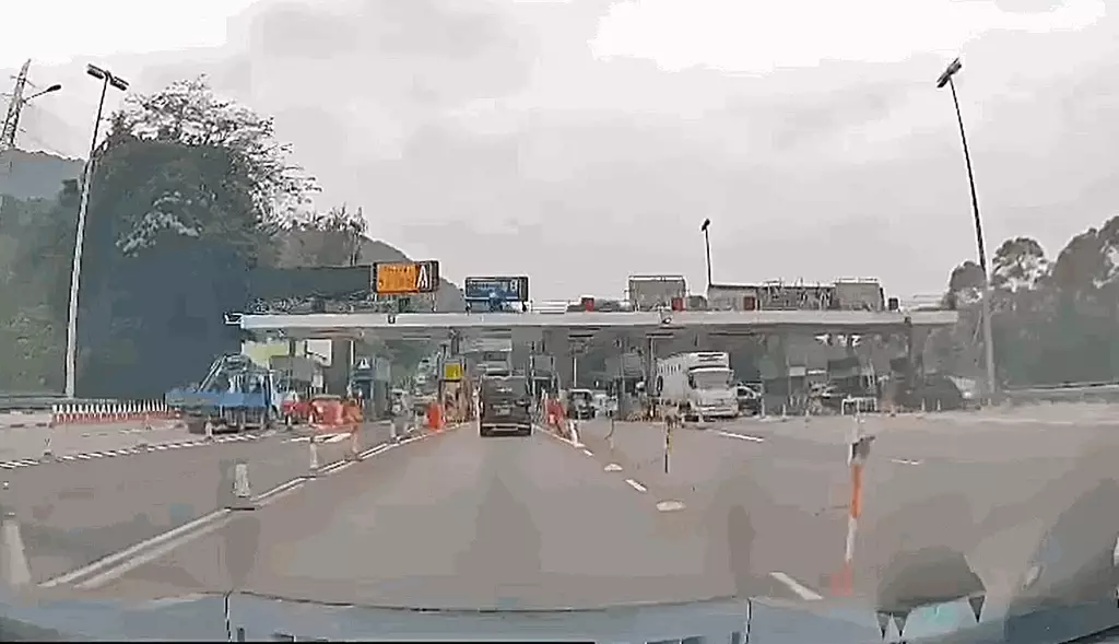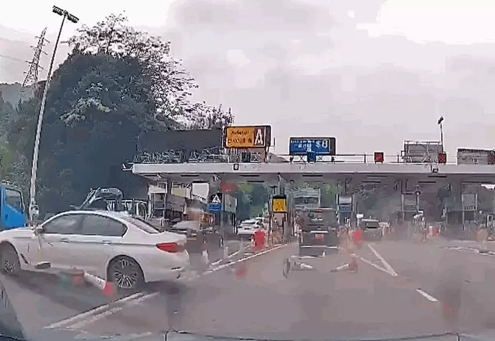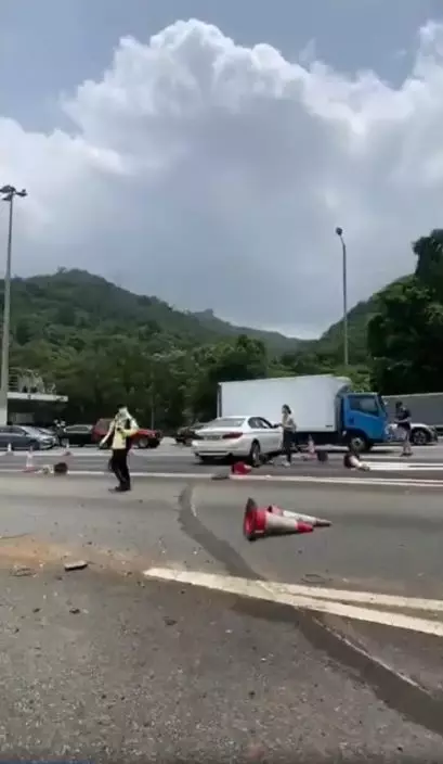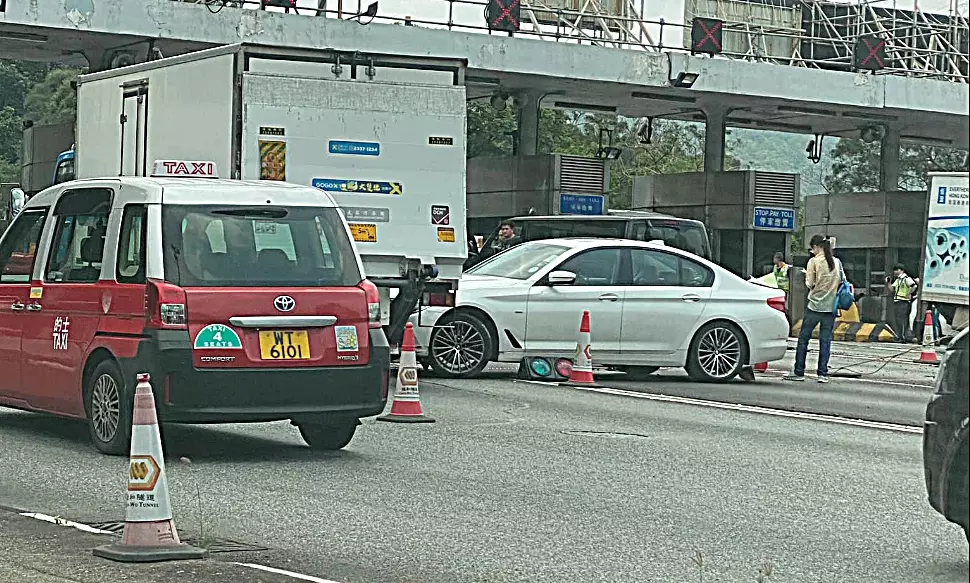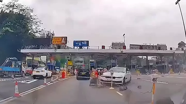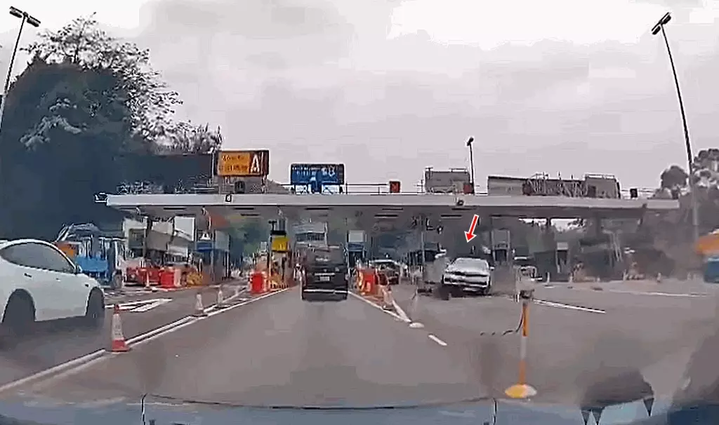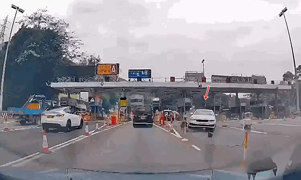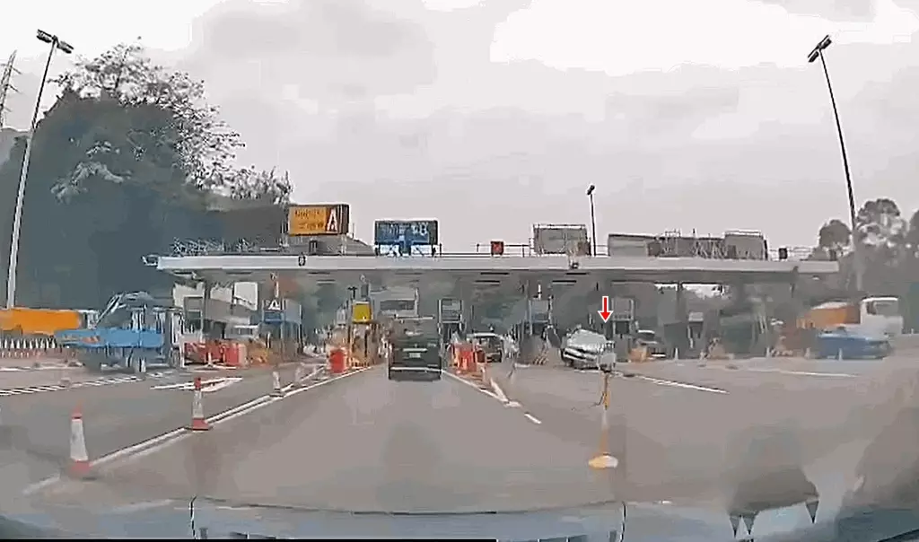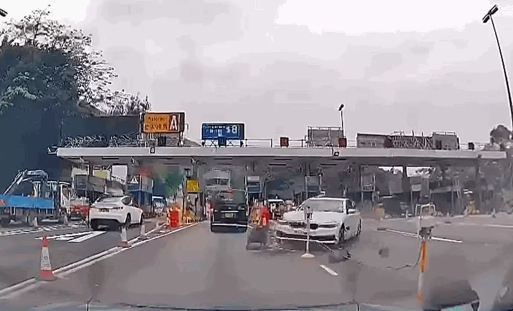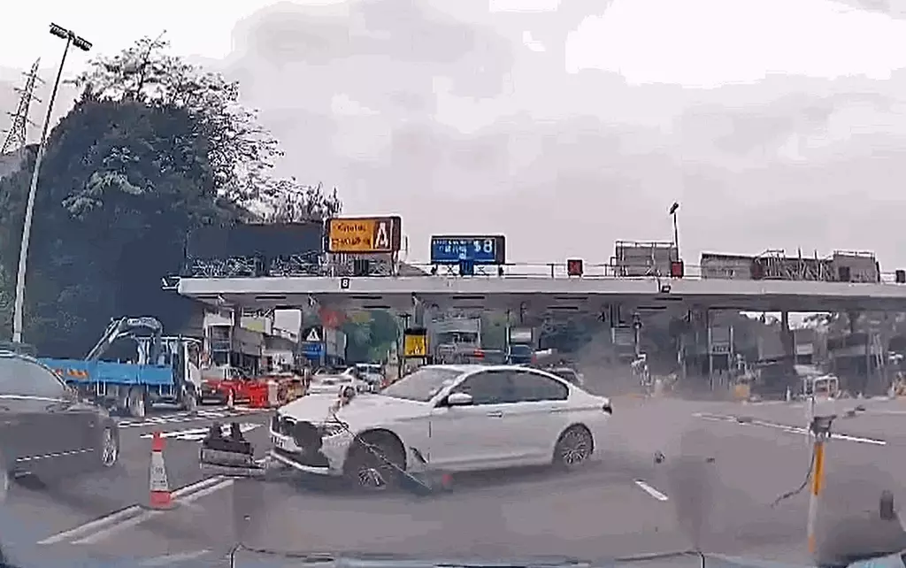 獅子山隧道19日發生五車串燒車禍,驚險片段20日流出,片中一輛寶馬白色私家車衝過收費亭後失控,掃毀指示燈及雪糕筒,橫越對面線,最終釀成五車相撞,慶幸無人受傷。