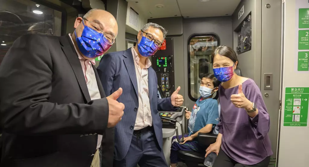 港鐵20日進行了一趟「車長夢‧之旅」活動,安排身患罕見先天性遺傳肌肉萎縮「杜興氏肌肉營養不良症」的「蝸牛仔」陳梓鍵登上港鐵列車駕駛室,進行列車車長體驗。