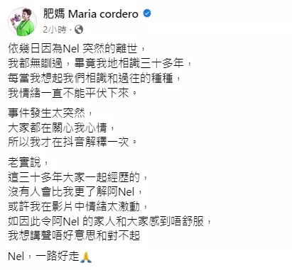 肥媽日前在抖音片上載「深切緬懷亡友NelNel張學潤」的短片。