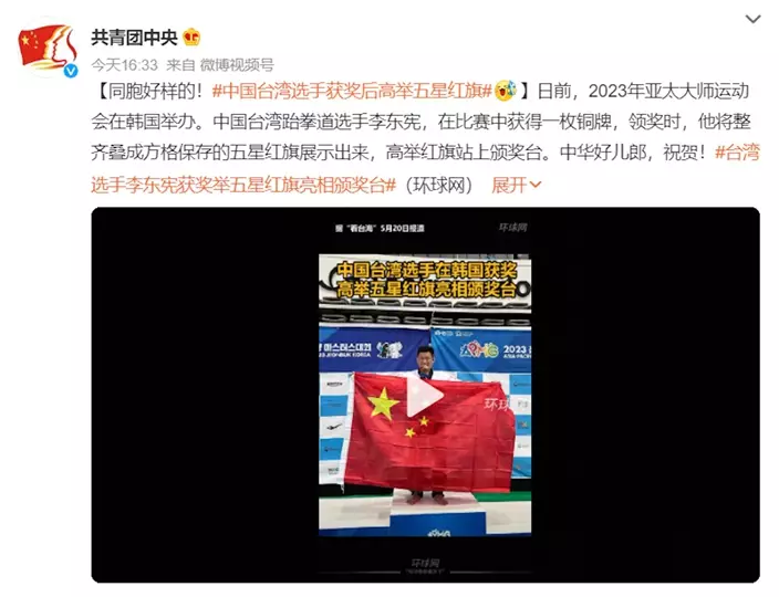 2023年亞太大師運動會日前在韓國舉行,來自台南的跆拳道選手李東憲拿下銅牌,並於頒獎台上高舉五星五星紅旗。這一幕被眾多媒體轉發,有大陸網友在微博上稱讚:「這才是同胞,堂堂正正的中國人」;「中華好兒郎,祝賀!」。