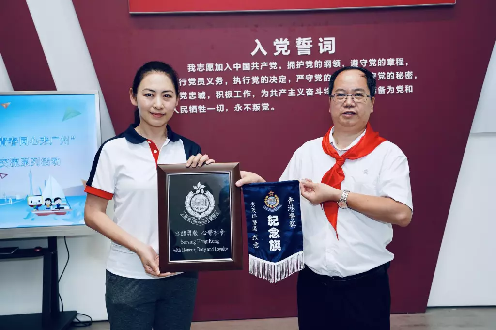 秀茂坪警區指揮官謝翠恩總警司與廣州市少年宮副主任楊偉文互贈紀念品。少年警訊圖片