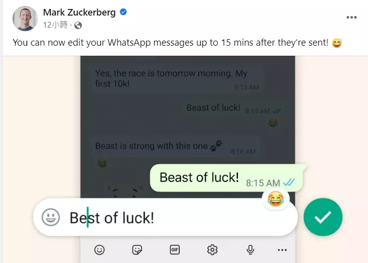 WhatsApp母公司Meta行政總裁朱克伯格5月22日在Facebook發帖文,正式宣布推出上述編輯新功能。