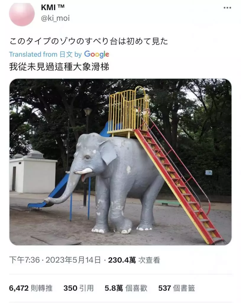 最近,1名日本網友@ki_moi在推特上分享了在一處公園裡見到一座奇妙的大象滑梯,表示以往見到的公園多數讓大象側身,象鼻就是做成滑梯的平面,屁股則是作為可以爬上去的樓梯,所以這樣的設計都較為卡通。然而,在東京北區飛鳥山公園的大象卻是擬真,大象的身體與溜滑梯無關,而是成為一個單純的支架,讓推主驚呼道:「我還是第一次看到這種造型的大象溜滑梯!」。