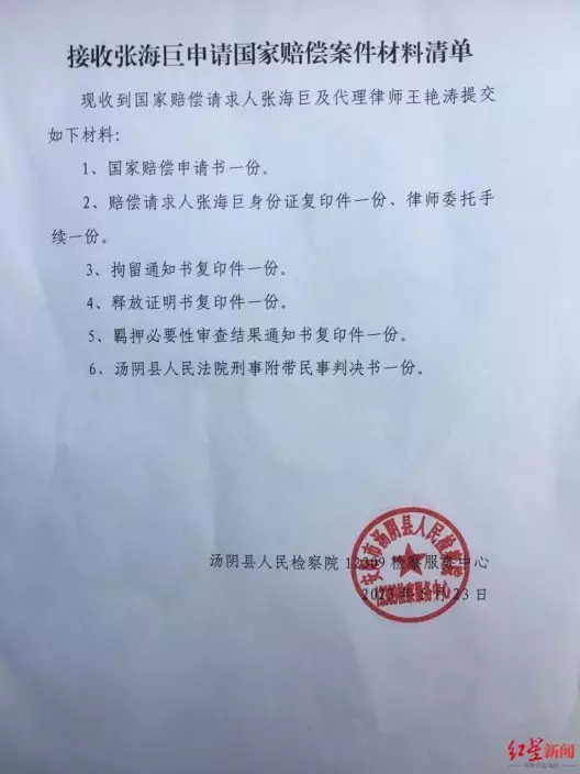 根據國賠申請書,張海巨要求法院就侵犯公民人身自由賠償15萬9901.74元、給予精神損害撫慰金50萬元。此外,他還要求在法院影響範圍內公開登報為其恢復名譽、賠禮道歉,並向當初作出逮捕決定的檢察官和出庭的檢察員辦錯案追責。