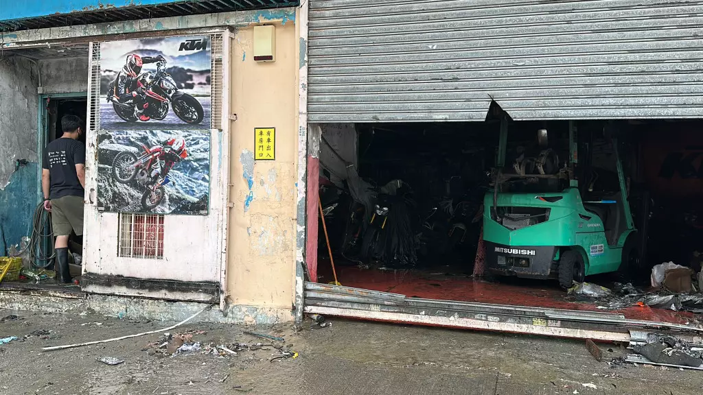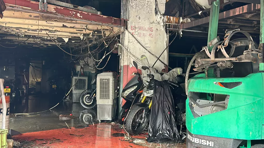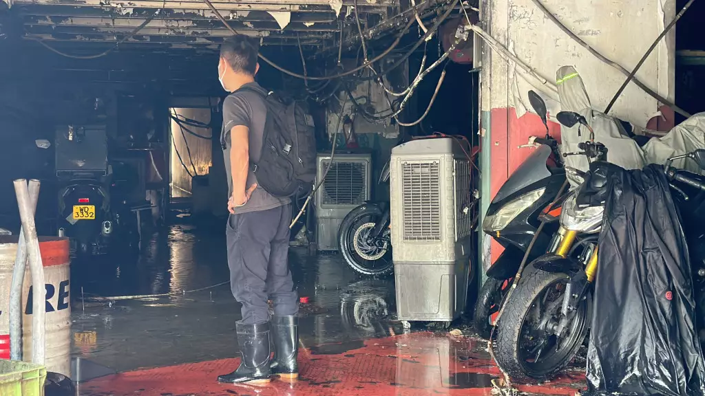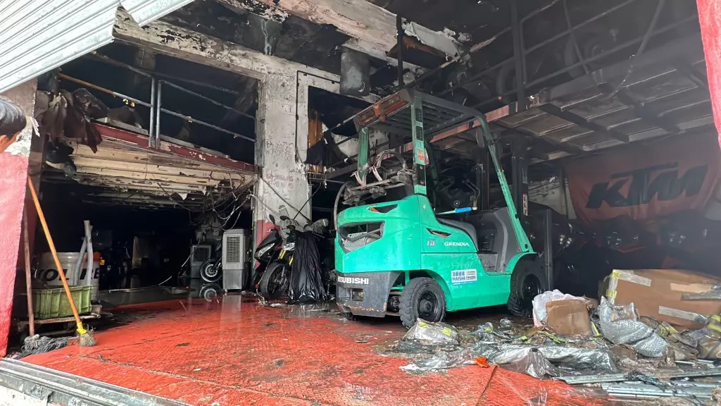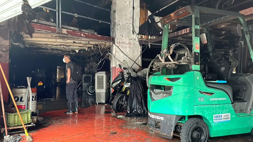 下午1時許,涉事車房解封,負責人急不及待進入鋪內,查看損毀情況。現場是燦基電單車行有限公司,所見車房面積約3,000呎,大火過後一片狼藉,周圍嚴重燻黑,部分地方及設備更燒剩支架,據知該公司代理多個電單車品牌,也是本田電單車的指定維修中心,以及是KTM陳列室及維修中心。當中擺放在內的多輛電單車,包括新車及待修車輛均付之一炬,地面因消防救火亦遺下大量積水。車房負責人連先生初步點算損失最少600萬元,不排除因工廠大廈電線老化短路肇禍,火警原因有待消防調查。