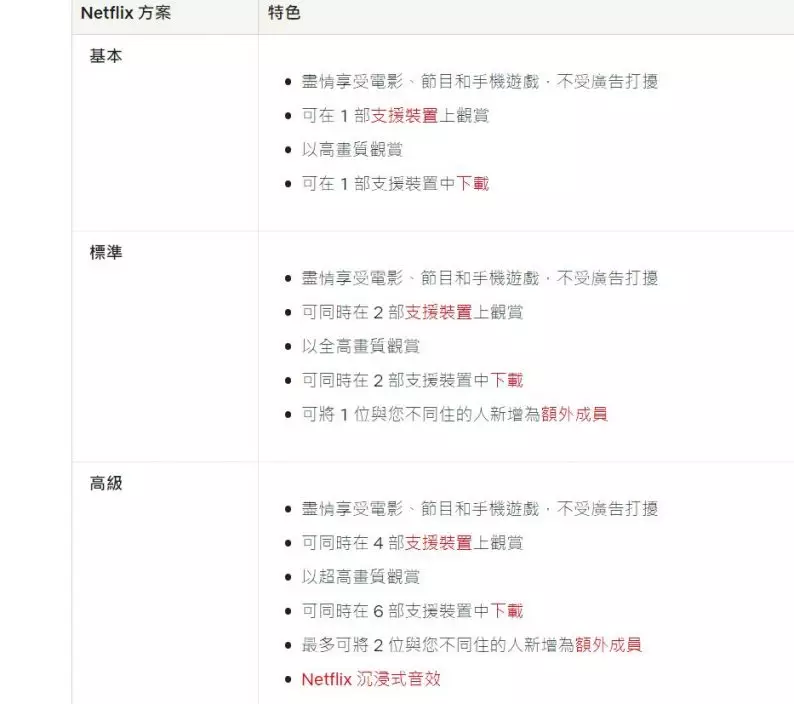 香港Netflix官網顯示的收費表。網上截圖
