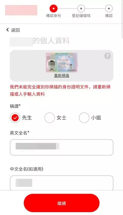 電訊商A當中,記者嘗試上傳網上下載的他人身分證照片,並輸入該身分證號碼,最後因影像不清晰或不完整,登記失敗。