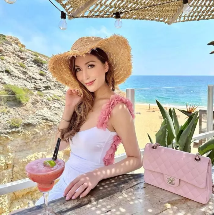 近日何鍶珩又飛到葡萄牙度假,其間換上白色花花邊一件頭在沙灘影靚相,一雙逆天白滑長腿非常養眼,獲不少網民留言大讚火辣。而其中一張餐廳打卡照中,何鍶珩身旁價值78,500港元的Chanel粉紅色手袋亦十分搶眼,與身上粉色花花更是襯到絕!