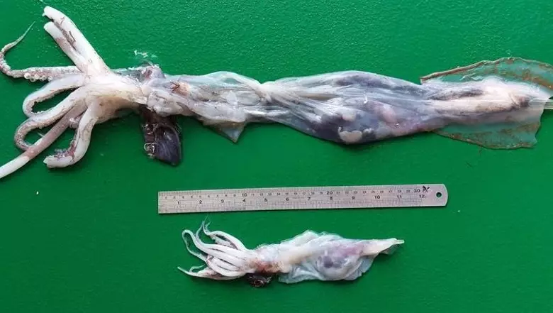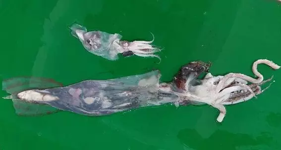 從照片中可看到,一條長約60cm、像魷魚的頭足動物,上半部幾乎是透明的,肉眼清晰可見裡面有被牠捕獲的約15cm的小魚等;另一條較小的也有約20cm,上半部也呈透明狀。