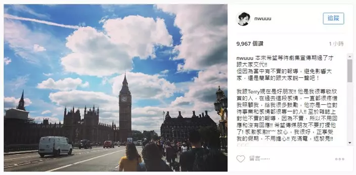 身在英國的定欣剛在instagram承認分手一事,留言道:「本來希望等待劇集宣傳期過了才跟大家交代!!但因為當中有不實的報導(道),避免影響大家,還是簡單的跟大家說一聲吧!」