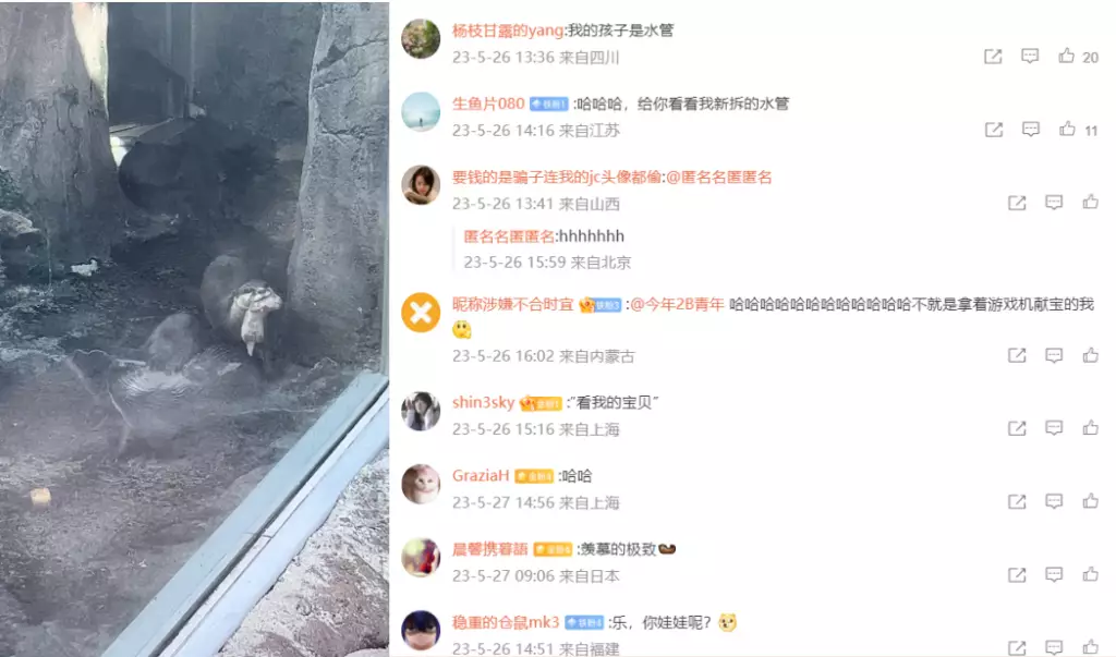 爭相「曬B」的有趣畫面令遊客哭笑不得,十分趣智,而它們無厘頭的模仿行為更萌翻無數網友,網友紛紛笑稱,「我的孩子是水管」、「給你看看我新拆的水管」、「水獺媽媽︰看看我的寶寶是不是很可愛? 暴徒水獺︰快來看看這個酷水管!」。