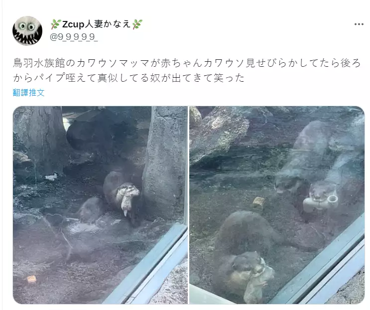 近日,一名日本網友到日本三重縣鳥羽水族館參觀,在走到水獺生活區時,他看到一隻水獺媽媽叼著寶寶,越過一眾同伴走到展示區的玻璃面前,驕傲地抬起頭,向圍觀遊客「曬B」,成為全場焦點。正當遊客欣賞這幅可愛模樣時,另一隻水獺似乎都想加入,不過自己又無BB,為了模仿同伴,竟然叼著一節水管跑到水獺媽媽身旁向大家「曬水管」!