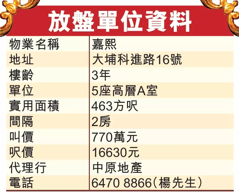 大埔白石角新晉屋苑嘉熙,入伙約3年,會所設施簇新多 元,受不少年輕買家青睞。今日介紹5座高層A室,實用面積463 方呎,2房間隔,大廳裝修新淨,露台外望區內樓景,現時叫價770萬,實用呎價約16630元。