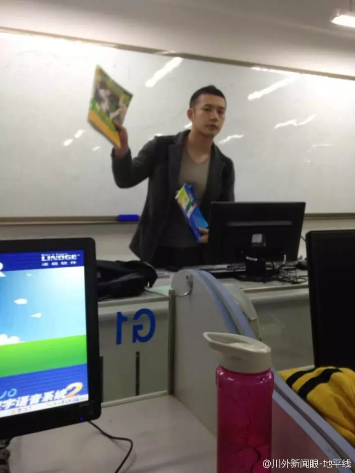 80後英語教師甘麟翰是四川外國語學院大學生外語教學部的一名英語老師,去年入職任教,之前在其他地方讀研究生課程。令甘麟翰爆紅的是一張商學院大學一年級學拍攝的照片:右手舉起教材,眼睛看著偷拍自己的學生。照片最初只是在四川以外的學生之間流傳,之後四川外國語大學校報《地平線》搜集更多照片放在微博,短短一天內轉發過千次。
