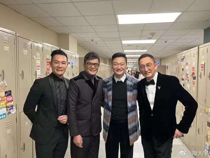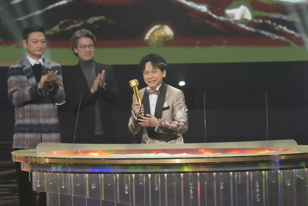 在頒獎典禮中與幾位師兄弟張兆輝、黃日華及吳啟華合照。