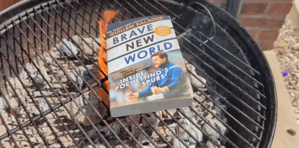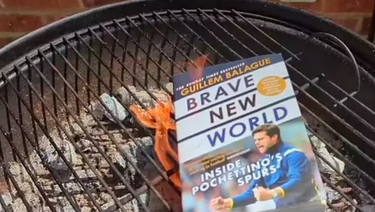 一位熱刺球迷對普捷天奴上任車路士領隊反應激烈,將一本名為《Brave New World》的書放上BBQ爐。網上圖片