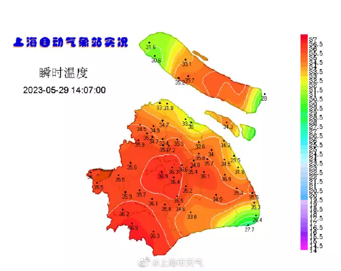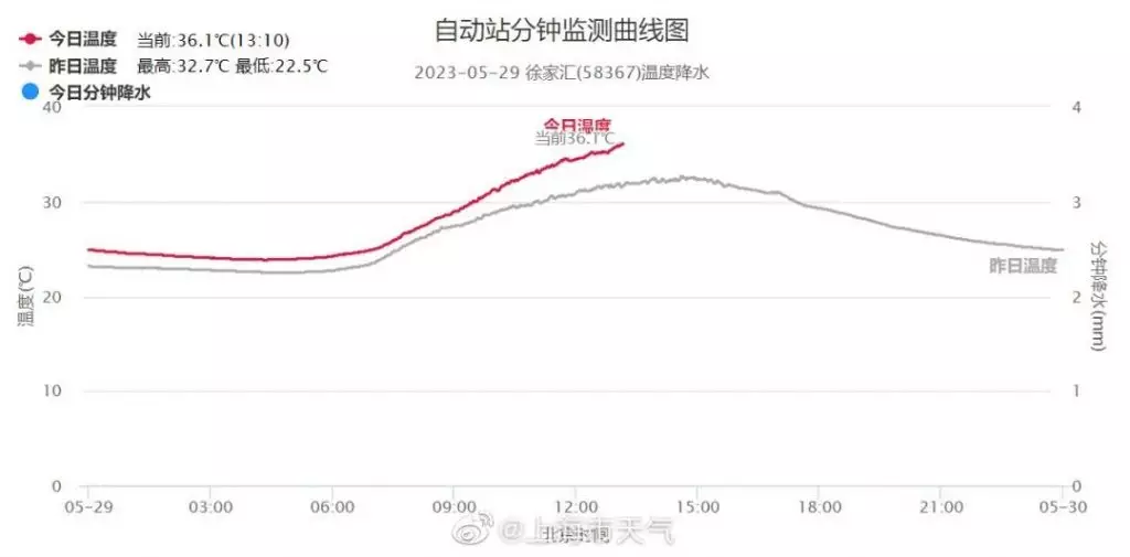 上海氣象局在官方微博發文說:「13時09分,徐家匯站最高氣溫衝上攝氏36.1度,打破100年來5月最高氣溫紀錄。」