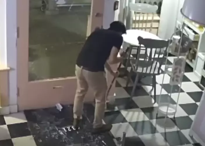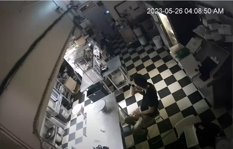 進到蛋糕店,這個小偷竟不慌不忙,好似返到自己家一樣,慢騰騰移到吧台洗手,然後坐低飲水,之後更做出了讓所有人都意想不到的行為:拿過角落的拖把和水桶,開始搞清潔!