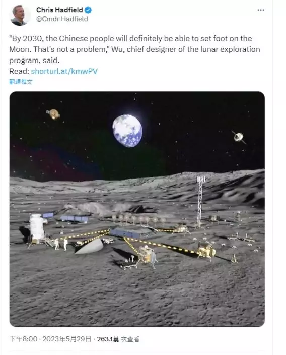 首位執行太空漫步的加拿大太空人Chris Hadfield在Twitter發文指2030年中國要登月。