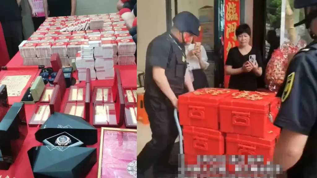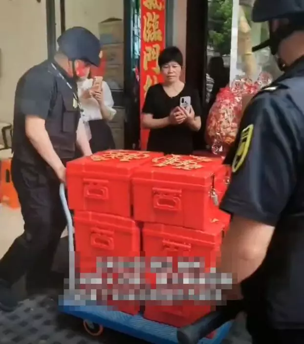 30日上午,有浙江網民拍攝到一輛黑色運鈔車停靠在路邊,四名押運人員用拖車拖了6個大紅色錢箱進到訂婚的現場。另外,網傳一張現場圖片顯示,桌子上堆滿了現金,還有首飾、金磚、名表等。看到滿桌的彩禮,網友紛紛大表驚嘆。