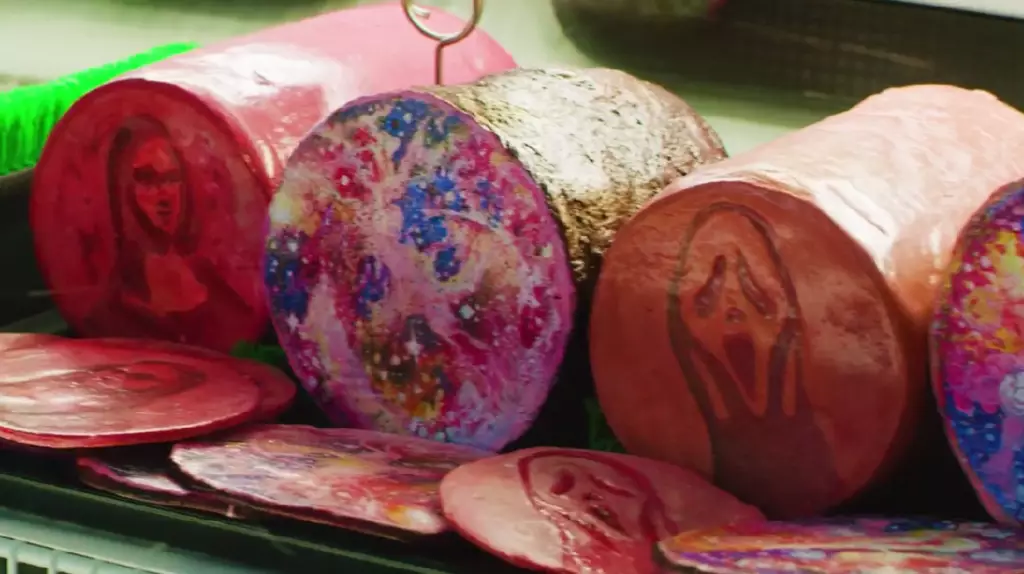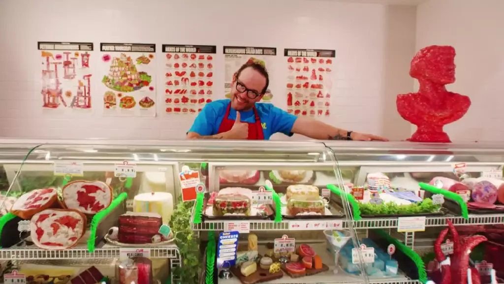 在影片中可以看到,Omega Mart當中有各種驚人的商品,如「刺青的雞肉」擺在生菜裝飾的盤子上,放在看起來像雪櫃的展示櫃裡;一條「灰白色的蛇」擺在貨架上,像是某種香腸;還有一款專為舉重運動員設計的藍色牙膏等等。