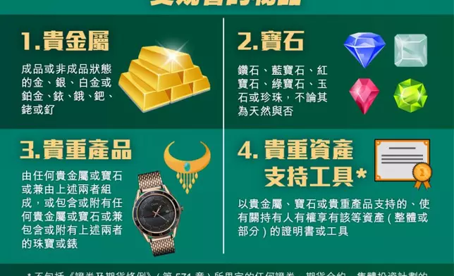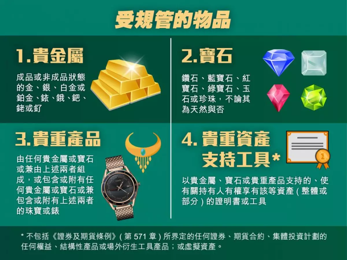 註冊制度中受規管的物品不限於貴金屬及寶石,當中還涉及了貴重產品及貴重資產支持工具。詳情如下: