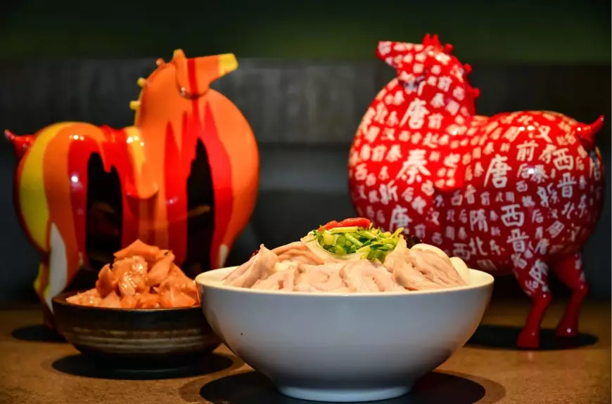 「長安葫蘆雞」起源於唐代官廚,是陝西傳統風味名菜,享有古都「長安第一味」盛譽。長安葫蘆雞食材包括丹鳳白羽雞、糖藝葫蘆、象形椒麻小雞等。葫蘆雞菜品經過清煮、蒸籠、油炸三道工序烹製而成,色澤金紅,皮酥肉嫩。配以糖芝葫蘆,葫蘆諧音福祿,寓意福祿禎祥、福壽錦長。
