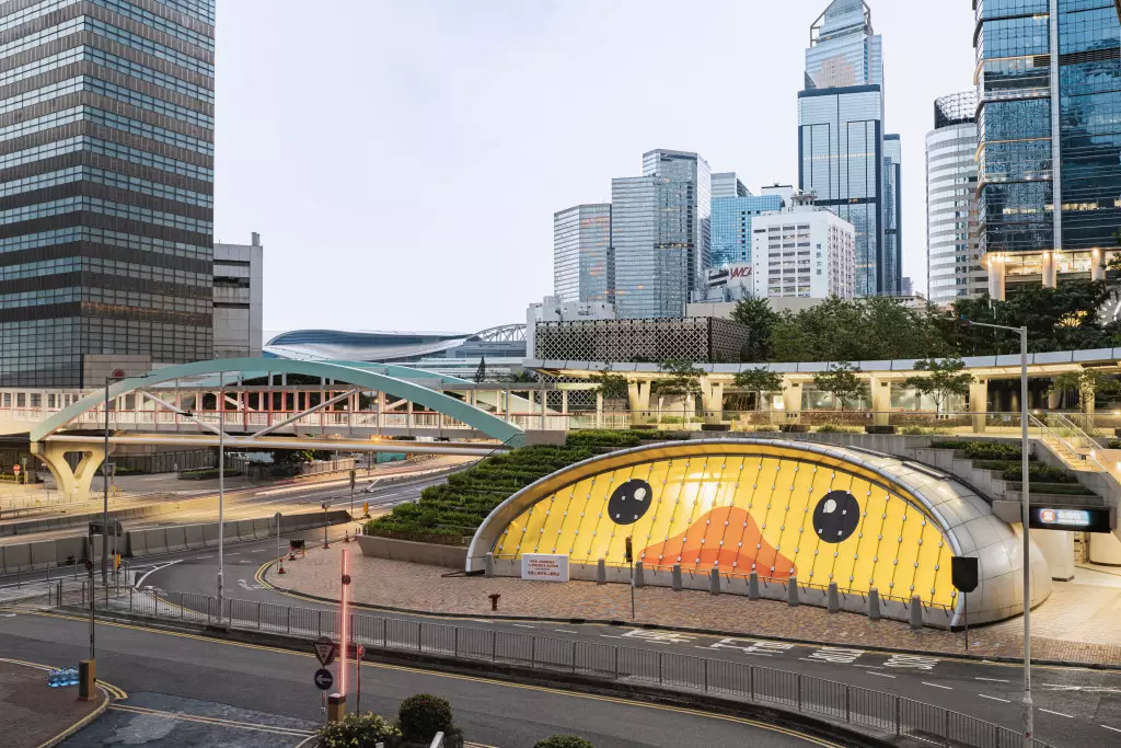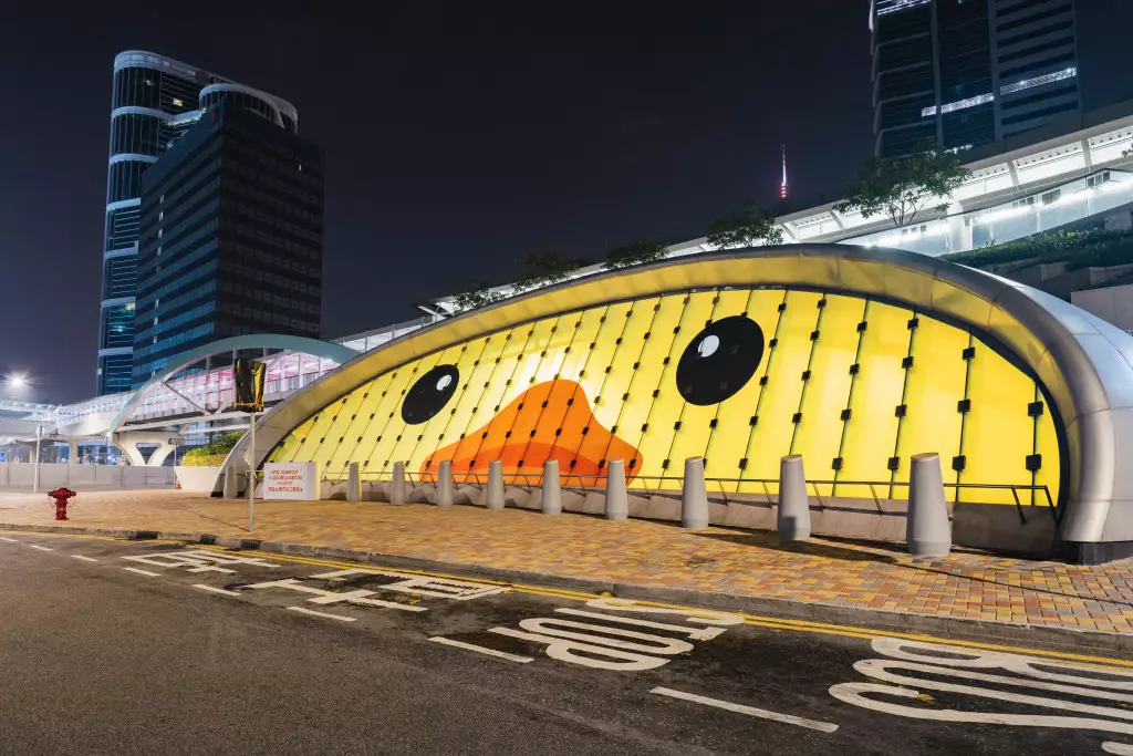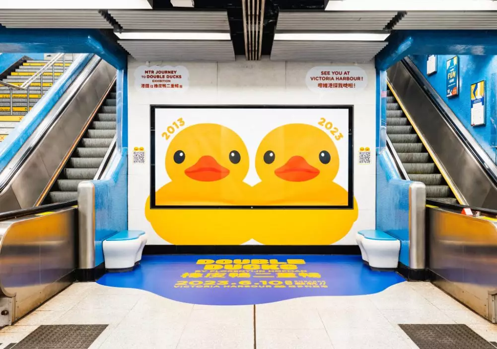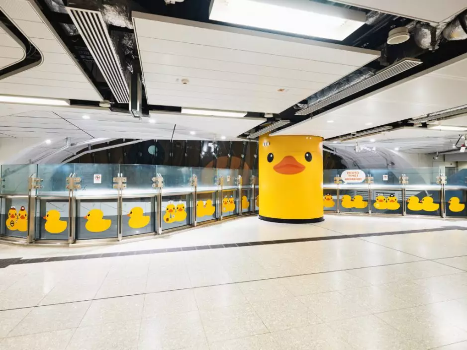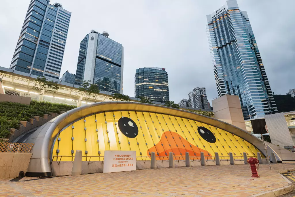這趟藝術旅程中最接近《橡皮鴨二重暢》展覽的金鐘站,即日起搖身一變成為期間限定「橡皮鴨主題 車站」,E 出口亦成為「橡皮鴨主題出口」,站內多處包括月台旁等,都可發現橡皮鴨影蹤及與展覽 有關的設計如橡皮鴨腳印、水滴等,全方位佈滿可愛的橡皮鴨圖案,打造一系列主題打卡位,引領着 大家前往展覽場地!除了一群可愛的橡皮鴨外,金鐘站 E 出口 6 米高 24.5 米闊的巨型玻璃天窗更令人 眼前為之一亮,半圓玻璃天窗首次化身成趣緻鴨子臉,一隻充滿好奇心的橡皮鴨探頭窺看,就像與維 港上暢遊的一雙橡皮鴨遙遙相望。另外,香港站首次曝光的大型數碼全景互動顯示區更率先由橡皮鴨 打頭炮,屏幕上巨型橡皮鴨彷如暢游維港般輕輕搖晃,現身港鐵站與乘客互動,屏幕上方亦不時會落 下小鴨,通過感應裝置,碰到途經乘客的頭部便會彈出充滿正能量的心型圖案,加上整個空間播放著 愉悅繽紛的音樂,為大眾繁忙的生活添上樂趣。