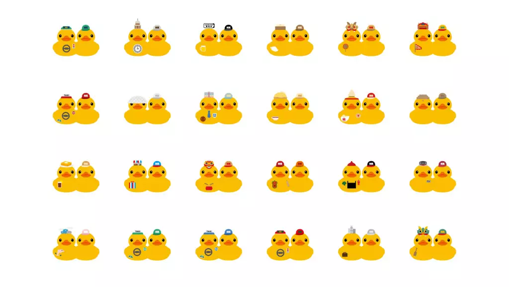 AllRightsReserved 與霍夫曼都希望讓藝術走進生活,加強與香港聯繫,將橡皮鴨糅合富有香港地道特 色的經典標誌,推出共 24 款獨特的「《橡皮鴨二重暢》遊香港特色」(《DOUBLE DUCKS with Hong Kong Signature Icons》)造型系列,如同讓一對橡皮鴨親自體驗香港特色!當中特色包括著名地標如 尖沙咀鐘樓、太空館、蘭桂坊及彩虹邨;地道美食如點心、菠蘿包與西多士;節慶如舞火龍、醒獅與 搶包山;文化如大戲棚及大佛;公共交通工具如的士、小巴與鐵路及本土特色如紅白藍膠袋、當舖、 街市等。