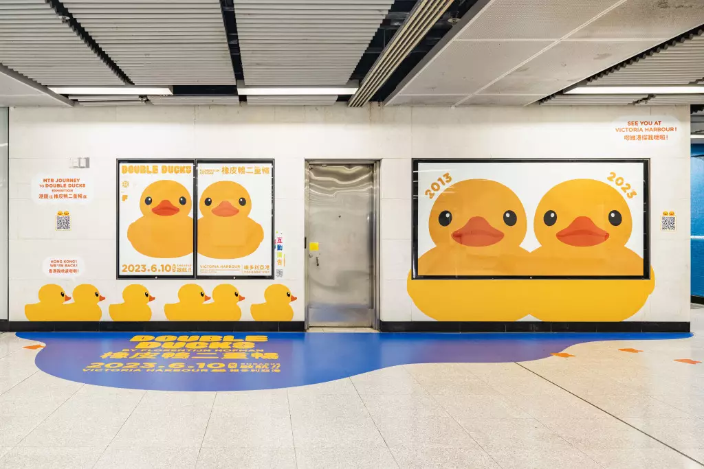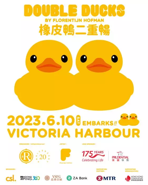 荷蘭藝術家霍夫曼(Florentijn Hofman)創作的巨型橡皮鴨,自 2007 年起遨「游」世界各地,2013 年的《橡皮鴨游世界.香港站》由創意品牌 AllRightsReserved(ARR)策展,吸引大批市民旅客蜂擁親臨維港海濱一睹真身,今年適逢橡皮鴨訪港 10 周年,ARR 特別主辦大型海上公共藝術展覽《橡皮鴨二重暢》,橡皮鴨首度偕同伴雙雙暢遊維多利亞港,於 6 月 10 日起開放予公眾,展期視乎天氣等情況而定,預計為期約兩星期。橡皮鴨停駐在維港海面,毗鄰添馬公園及中西區海濱長廊(中環段),為 10周年里程碑錦上添花,見證這次極具紀念值的歷史時刻,約定與市民旅客共聚美好時光。展覽獲全城熱烈支持,包括支持機構香港旅遊發展局及主力贊助保誠保險。其他贊助包括 csl.、昂坪 360、意博金融、ZA Bank,及合作夥伴港鐵公司。