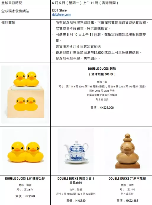 為慶祝巨型橡皮鴨訪港十周年,AllRightsReserved 與霍夫曼以橡皮鴨造型及標誌圖案,特別推出一系 列獨家主題紀念品,其中包括全球限量只有 300 枚銅像雕塑、全手工精製原木雕塑、並肩造型的 3.5 吋搪膠公仔及可愛毛絨公仔、可以隨時組合或分開的吊飾磁石毛公仔;部分精品更富有地道特色,包 括麻雀連籌碼套裝,與以傳統青花紋飾繪有香港特色的陶瓷 3 合 1 茶具套裝;另外亦有適合家庭粉絲 的成人和兒童限定款 T 恤等。《橡皮鴨二重暢》系列紀念品將於香港時間 6 月 5 日上午 11 時起在 DDT Store網上開售,訂購的商品可選擇送貨或於展覽現場自取。展覽現場不設銷售,只供網上訂購後取貨。 數量有限,售完即止,記得把握機會入手!