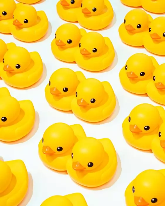 荷蘭藝術家弗洛倫泰因.霍夫曼(1977 年生)通過重新塑造日常物品的簡單視角,以挑戰觀眾欣賞事 物的舒適感。透過挑戰觀眾對日常物品的單一觀點,其藝術作品的熟悉感與積極性,予公眾能以親切 的方式探索藝術讓人們以親切的方式探索藝術,打破他們對事物的固有認知。霍夫曼他將這些概念創 作轉化為簡單明瞭的形象,創作製造龐大奇怪異的「玩具」,通過其巨大的體積和材質,以全新角度 創作極具新鮮感的藝術作品。例如,他的作品《橡皮鴨》(Rubber Duck,2007 年)曾經在世界各地的 海岸出現,足跡遍及包括法國、巴西、新西蘭、香港,甚至智利的聖地亞哥,極具辨識度並這個巨充 氣橡皮鴨廣受關注。