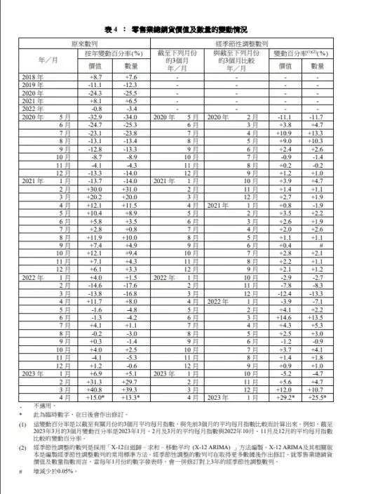 另一方面,2023年4月與2022年同月比較,超級市場貨品的銷貨價值下跌7.9%。其次為電器及其他未分類耐用消費品(銷貨價值下跌13.1%);燃料(下跌10.2%);以及傢具及固定裝置(下跌26.0%)。截至2023年4月底的三個月,與先前三個月比較,經季節性調整的零售業總銷貨價值的臨時估計上升29.2%,而經季節性調整的零售業總銷貨數量的臨時估計則上升25.5%。