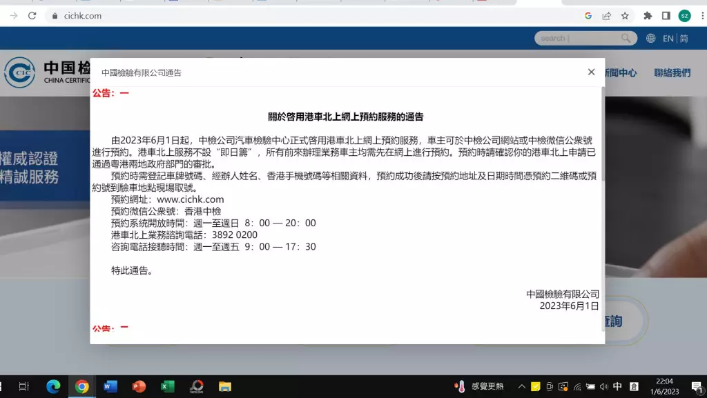 中國檢驗有限公司今日在網頁上刊登公告,今日起正式啟用「港車北上」網上預約服務。中檢網頁