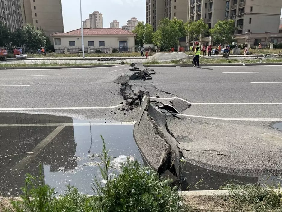 5月31日開始網上流傳天津市津南區八里台鎮碧桂園東門八里台路地面發生波浪狀凸起,路面脹開,附近高層住宅樓也出現開裂下沉的消息。
