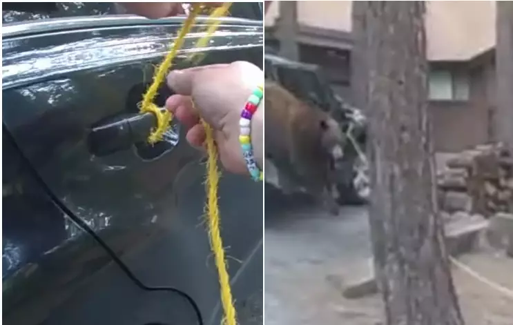 最後,警方想出了一條「好橋」。他們拿出一條超長繩子,先將繩子一端打幾個死結,綁實在車門把手上,然後趕緊躲到遠方的樹木後面,再拉開車門。車門被打開後,野熊即刻衝了出來,還差點被繩子絆倒,飛快地跑走了。
