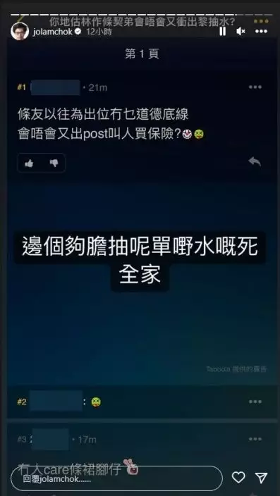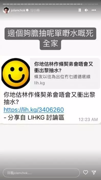 林作火速於IG轉發相關報道,並留言抽水,隨即引起網民怒罵無人性。