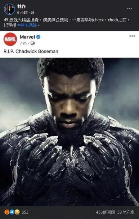 2020年8月28日,Marvel超級英雄片《黑豹Black Panther》男主角查特域克保斯曼不敵癌魔離世,林作一度出Po抽水。