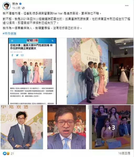 對於網民好奇自殺也可獲保險賠償?林作答:「對不起,我是2021年亞洲小姐競選時認識他的,如果當時就跟我買,他的保單至今就已經生效了超過12個月,那麼自殺不保條款已經失效了。」