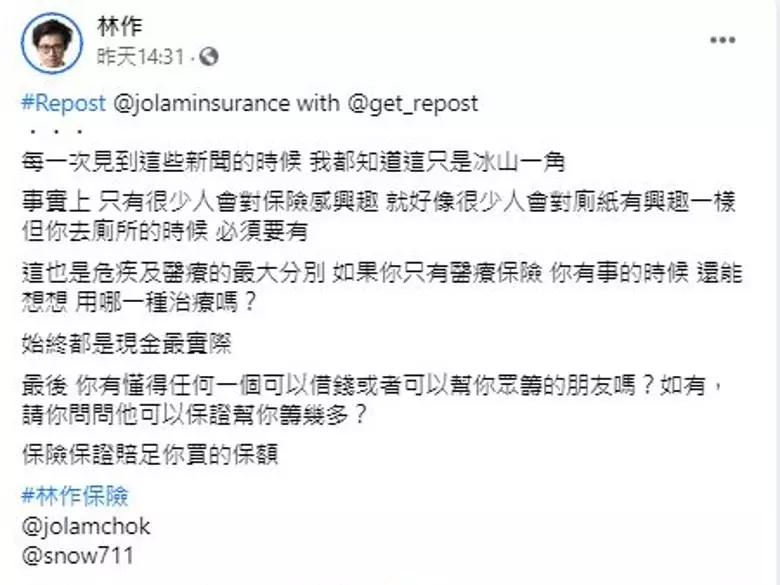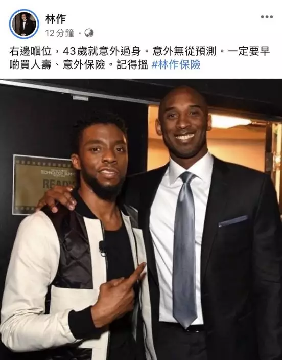 未幾林作再出Po,借2020年初因直昇機意外去世的籃球明星高比拜仁(Kobe Bryant)宣傳保險。
